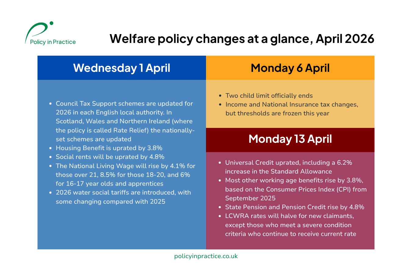Today, Wednesday 1 April 2026, marks the start of welfare policy changes and awards. Here’s our at a glance guide to the headline benefit uprating changes taking place this year.